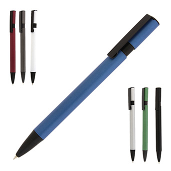 Caneta de alumínio com acionamento em click, corpo color com detalhes preto fosco.