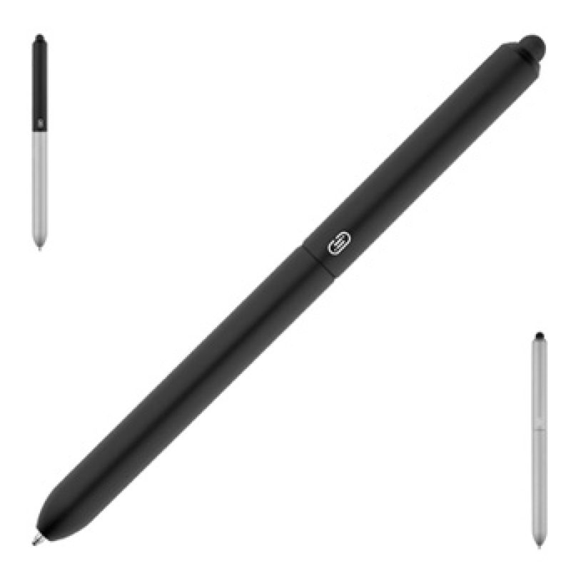 Esferográfica em alumínio com mecanismo twist. Ponteira touch em silicone.Recarga em metal “tipo-Cross”. Tinta Documental preta. Acompanha estojo.